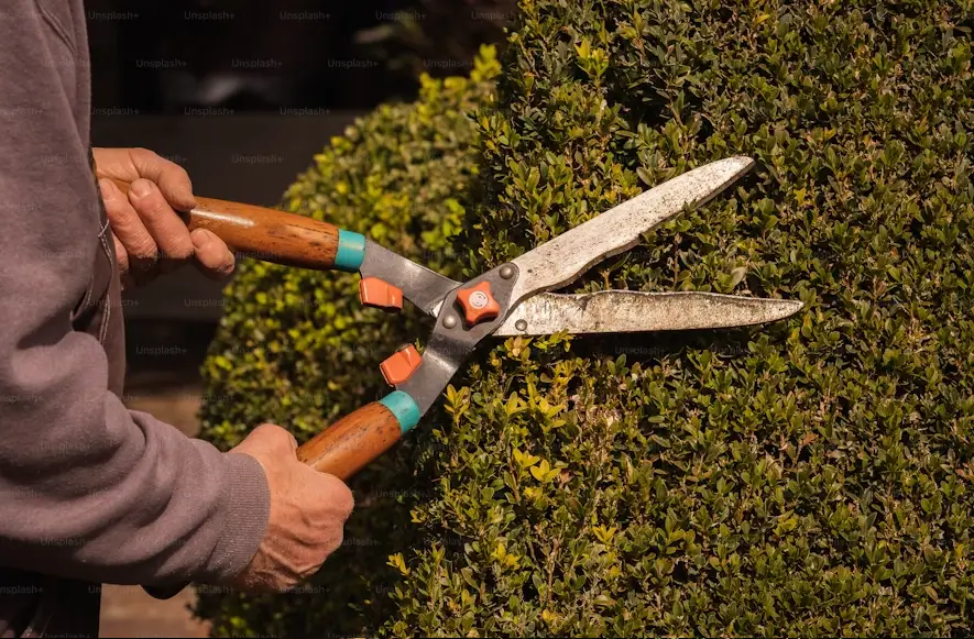 We first inspect the hedge type, condition, and layout to plan the right approach.